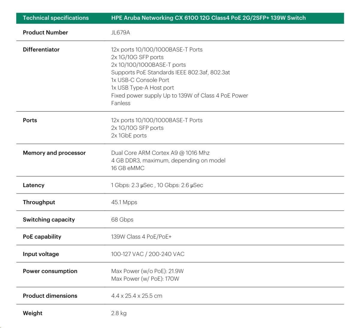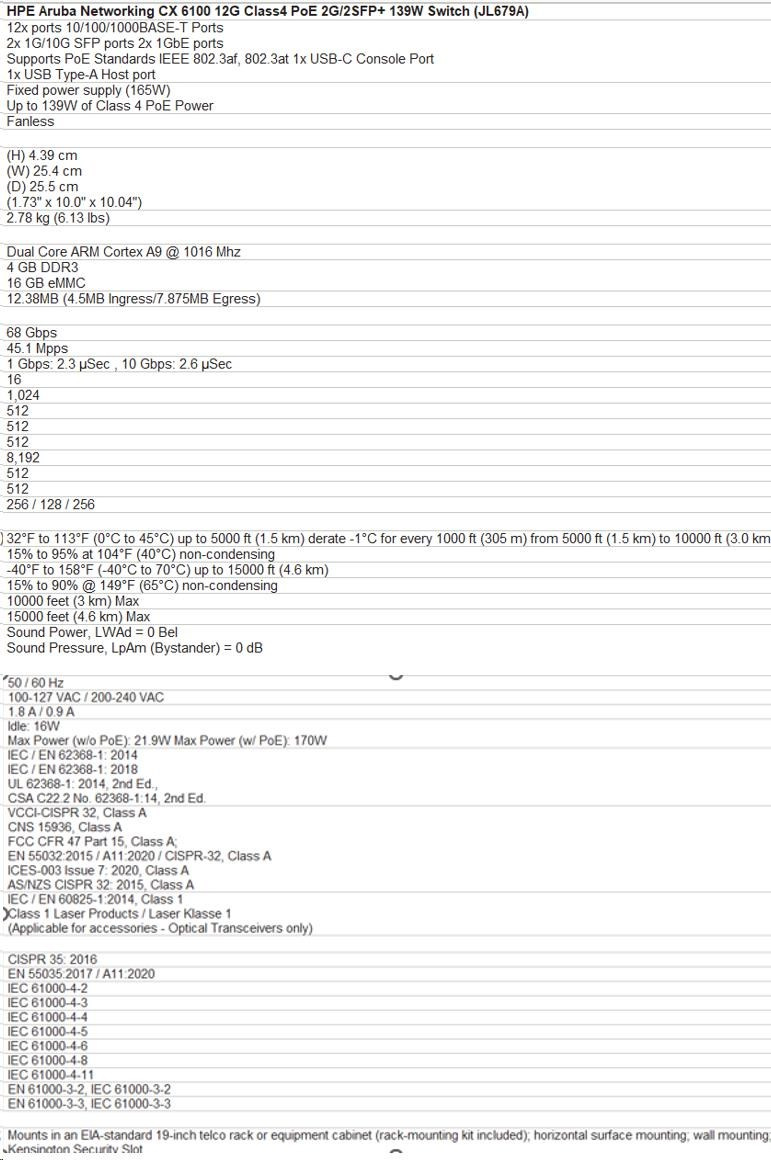 Aruba 6100 12G Class4 PoE 2G/2SFP+ 139W Switch (JL679A) | |