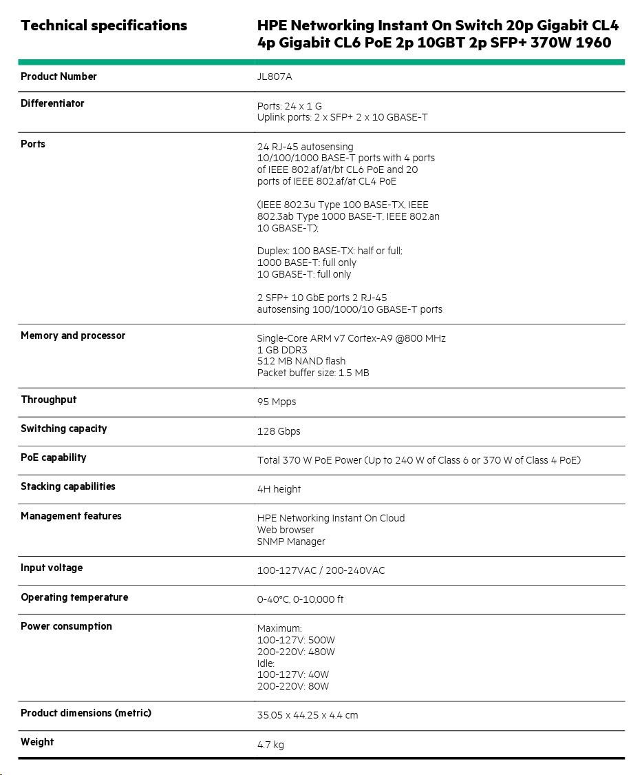 HPE Networking Instant On Switch 20p Gigabit CL4 4p Gigabit CL6 PoE 2p 10GBT 2p SFP+ 370W 1960 (JL807A).