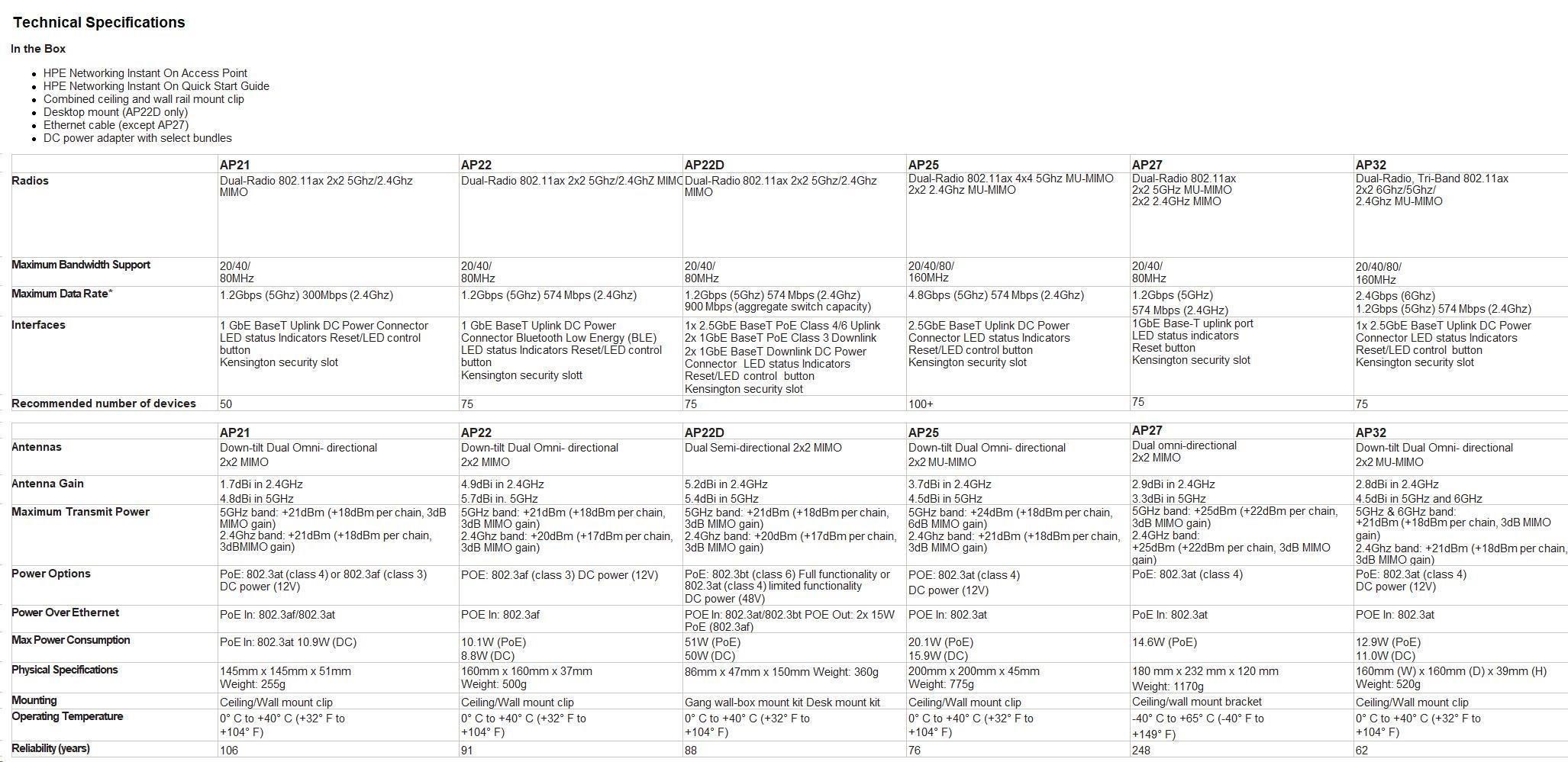 | Ultra-high-speed performance for high-density small businesses. Perfect for gaming, boutique hotels, tech start-ups and professional offices. The rise of the remote and hybrid workplace has placed increased pressure on business networks. Existing Wi-Fi infrastructure is struggling to support the explosion of devices and bandwidthhungry applications - all contributing to spotty video calls and sluggish download speeds. The Aruba Instant On AP25, a 4x4 Wi-Fi 6 access point, is designed to meet the increasing volume of connected devices. Delivering superior performance, coverage, and speed at a competitive price, the AP25 is the perfect access point for small and growing businesses. The Wi-Fi Certified 6TM AP25 delivers faster Wi-Fi speeds, greater capacity, and reduced latency between access points and devices for a superior Wi-Fi experience. AP25 improves efficiency and reduces congestion for networks with many connected devices, making it ideal for high-density environments. And with 4x the capacity of 802.11ac access points, the AP25 provides exceptional user experience, allowing businesses to serve more customers with higher speed and less congestion. Features of the AP25 include orthogonal frequency-division multiple access (OFDMA), multi-user MIMO and target wake time (TWT). With up to 4 spatial streams (4SS) and 160MHz channel bandwidth (HE160), the AP25 provides groundbreaking wireless capabilities for businesses looking to boost performance and future-proof their networks. |