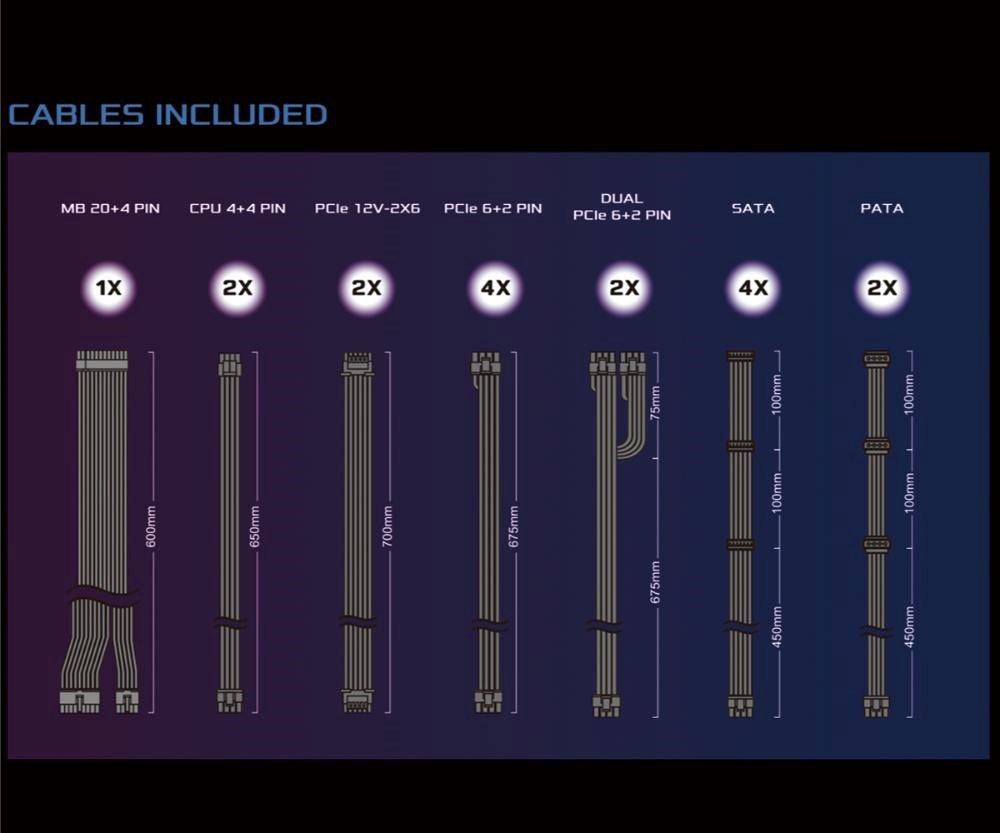 | Dueal PCIe 6+2 Pin Konektor | 2x / 2x (675 + 75 mm) |