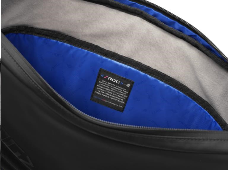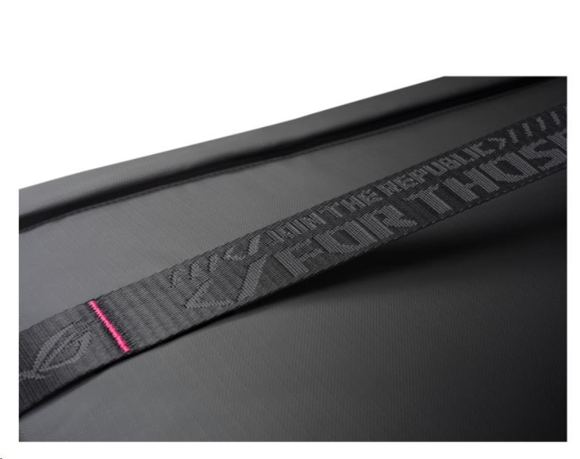 Tašku zdobí modré a růžové akcenty a prošívání, které jí dodávají barevný nádech a dávají světu najevo, že nosíte něco opravdu výjimečného. Vzheld ROG SLASH je také vybaven jedinečným monogramem ROG.