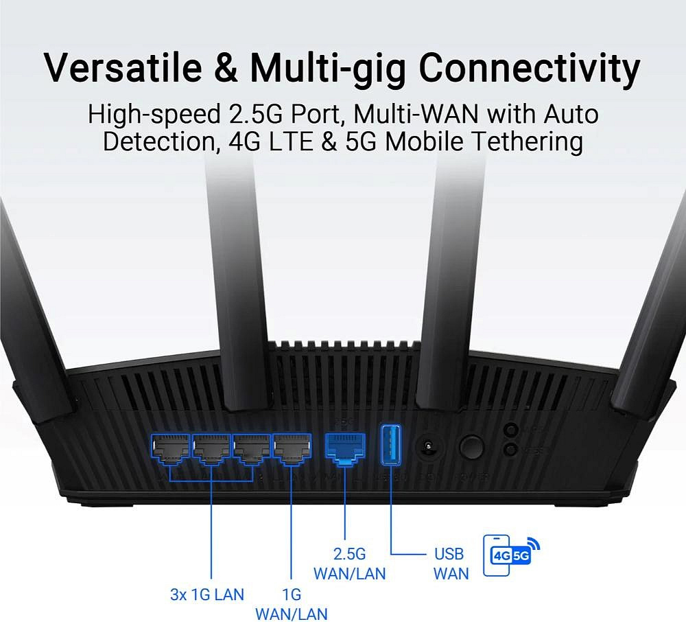 | Porty | 1x 2.5G for WAN/LAN, 1x 1G for WAN/LAN, 3 x 1G LAN, USB 3.2 Gen 1 x 1 |