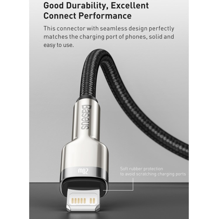 Kabel BASEUS Cafule Metal Series je odolný kabel, ve kterém jsou konce zástrček potaženy slitinou zinku, aby přežily dlouhé a intenzivní používání. Výrobek je také vybaven speciálním nylonovým opletením, které zabraňuje tření a chrání tak kabely uvnitř. Rovněž se zvýšila trvanlivost zástrček - prošly testem 10 000 připojení a byly speciálně profilovány tak, aby bylo možné kabel použít, i když je telefon v pouzdře. Kabel má funkci rychlého nabíjení PD 20W a přenosu dat. Jeho délka je 200 cm.