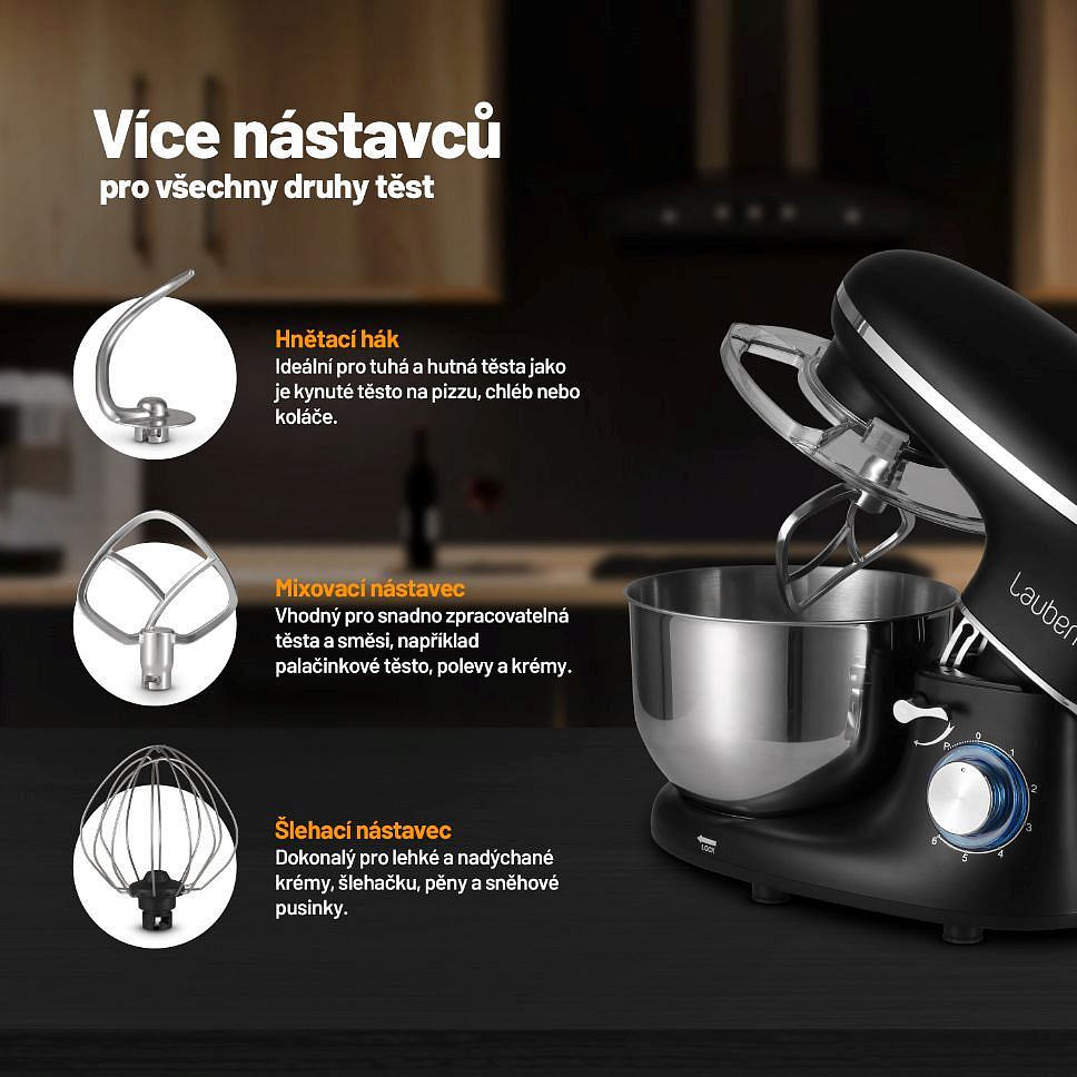 Základní balení robota zahrnuje nástavce pro šlehání, hnětení i mixování.