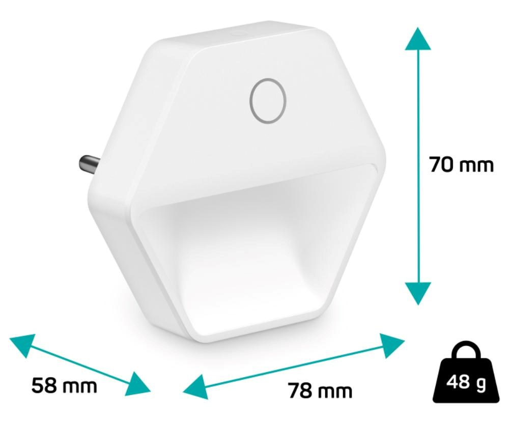 Světlo disponuje touch tlačítkem, které umožňuje zapnout/vypnout světlo a nastavit jas světla ve 3 úrovních. Světlo stačí jednoduše zapojit do libovolné zásuvky a při příkonu 0,60 W se nemusíte bát spotřeby elektrické energie. LED zdroj světla disponuje světelným tokem 30 lumenů.