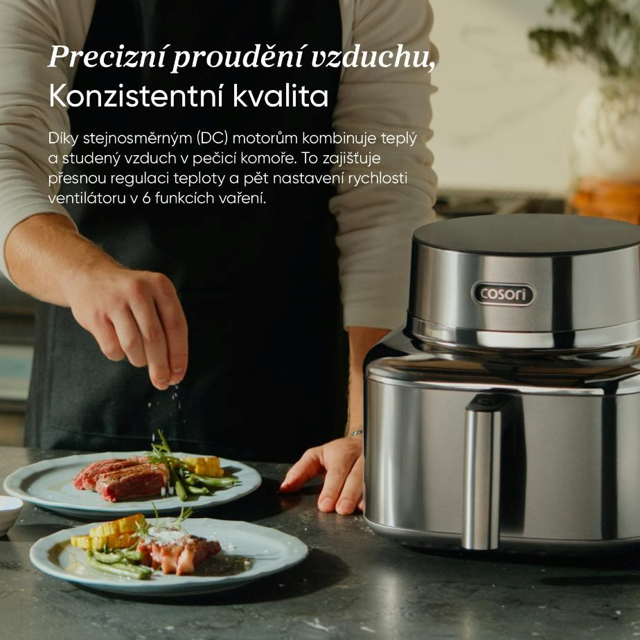 COSORI Iconic byl navržen jako přirozená součást moderního interiéru, ne jako obyčejný spotřebič. Nerezová ocel a tvrzené sklo vytvářejí čistý, klidný vzhled, který krásně zapadne do minimalistických kuchyní. Je to objekt, který potěší oko pokaždé, když kolem něj projdete.
