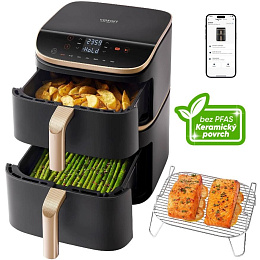 Zdravé vaření nyní získává zcela nový význam. Díky keramickému povrchu košů a až o 95% nižší spotřebě oleje si můžete užít smažená jídla mnohem zdravěji a především chutněji. Integrace chytré aplikace umožňuje ovládat horkovzdušnou fritézu na dálku, což poskytuje přístup k tisícům receptů a průběžnému stavu vaření, což usnadňuje přípravu zdravých a chutných pokrmů. Se sedmi univerzálními funkcemi, včetně fritování, pečení, grilování, sušení nebo kynutí, jde skutečně o multifunkční zařízení, které obohatí vaši kuchyni o neomezené možnosti vaření. Díky Wi-Fi konektivitě můžete fritézu ovládat a sledovat i vzdáleně a s aplikací získáte přístup k receptům a výživovým tipům.