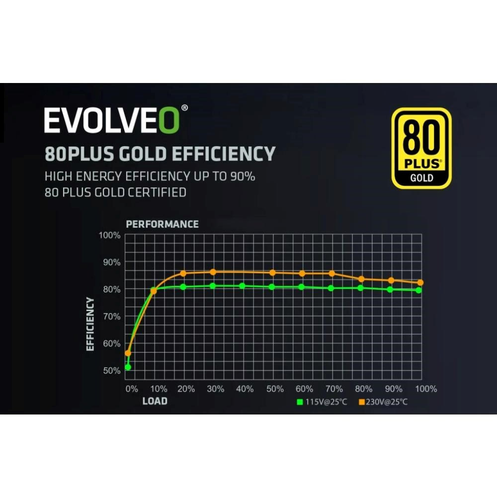 PC zdroj EVOLVEO G850-WH je hrdým držitelem certifikace 80 PLUS Gold, která slibuje až 92% účinnost (při běžném 50% zatížení). Minimální ztráty energie a nízké zahřívání jdou přitom ruku v ruce s tichým chodem 140mm HDB ventilátoru – ten má mezi hřídelí a ložisky speciální olejovou vrstvu a jeho tření je nepatrné, takže hlučnost zůstává na minimu. S tímto zdrojem vás zkrátka hučení ventilátoru neruší – slyšet je jen svištění kol vaší formule nebo řinčení zbraní vaší armády.