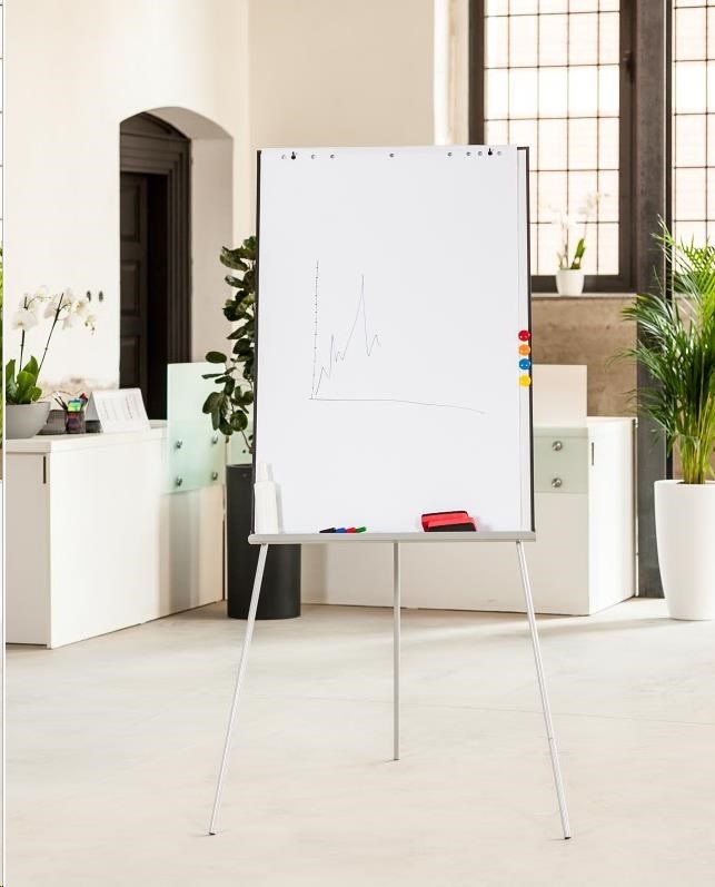 Flipchart s magnetickým povrchem. Flipchart disponuje bočními vyklápěcími lištami pro zavěšení potřebných materiálů.
