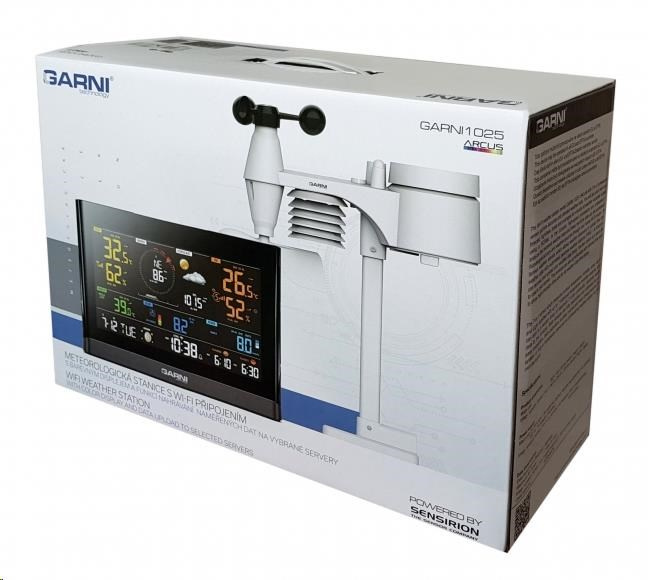 Wi-Fi meteorologická stanice model GARNI 1025 Arcus 2GEN s integrovaným bezdrátovým čidlem 7-v-1, která je vybavena mnoha funkcemi shromažďuje přesné a podrobné údaje o počasí. Integrované bezdrátové čidlo pracuje na frekvenci 868 MHz a měří vnější teplotu a relativní vlhkost, rychlost a směr větru, dešťové srážky, barometrický tlak, UV index a intenzitu slunečního záření. Výrobek používá vysoce přesná švýcarská čidla SENSIRION a umožňuje kalibraci některých meteorologických veličin.