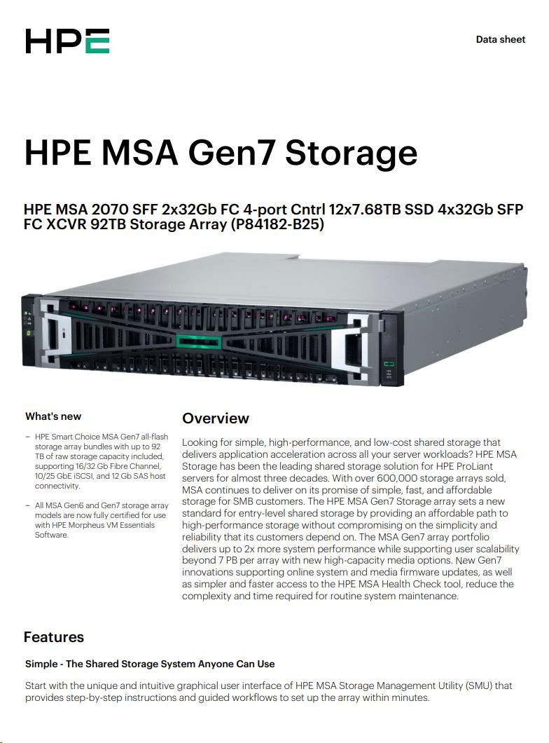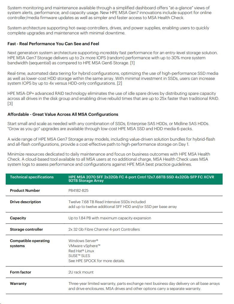 HPE MSA 2070 SFF 2x32Gb FC 4-port Controller 12x7.68TB SSD 4x32Gb SFP FC XCVR 92TB Storage Array Smart Choice.