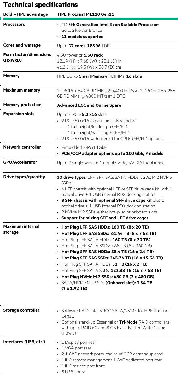 | Chassis | HPE ProLiant ML110 Gen11 LFF Configure-to-order Server |