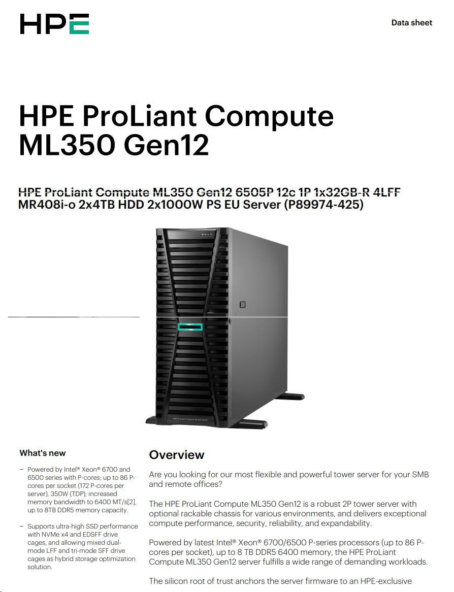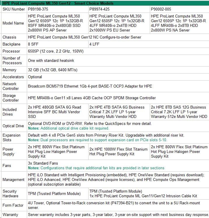 HPE PL ML350g12 6505P (2.2/12C) 1x32G (P69727) 2x4TB 4LFF MR408i-o2x1000W 1GbE NBD333 Smart Choice.