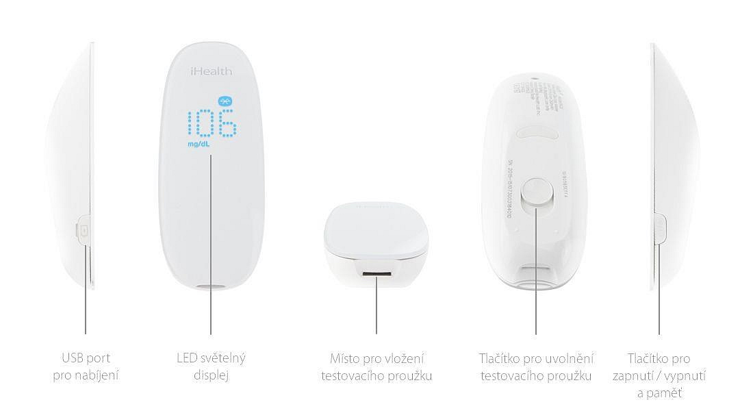Model Gluco+ BG5S Certifikace CE jako zdravotnické zařízení Měří aktuální glykémii z kapilární krve Bezdrátová komunikace Bluetooth V4.1 BLE Amperometrická metoda měření využívající glukózooxidázu Určeno pro osobní použití jediného pacienta Rozměry: 98 mm x 35 mm x 27,8 mm Hmotnost: 32,5 g Množství krve pro jedno měření: min. 0,7 µL Rozsah měření: 1.1 mmol/L ~ 33.3mmol/L Vnitřní paměť přístroje na posledních 500 měření Kompatibilní s těmito zařízeními Při plném nabití vystačí kapacita baterie přibližně na 200 měření USB nabíjecí kabel
