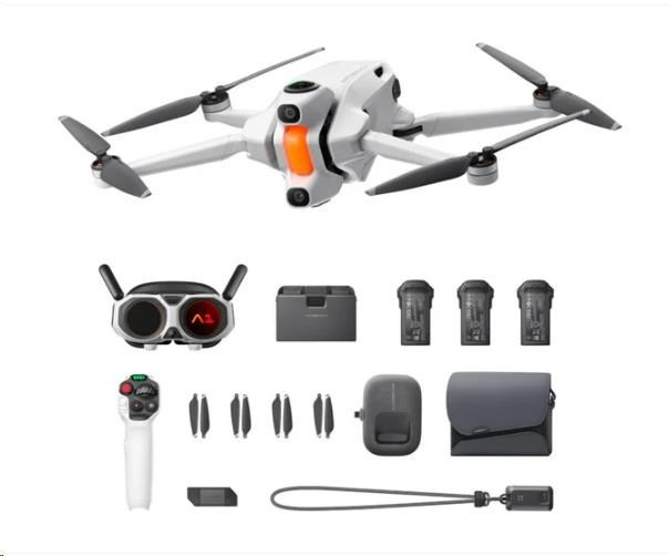 1× dron Antigravity A1 | 1× brýle Antigravity Vision | 1× pohybový ovladač Antigravity Grip | 3× vysokokapacitní letová baterie | 1× nabíjecí hub | 1× Quick Reader (čtečka) | 1× popruh na ovladač | 1× baterie pro Vision brýle | 1× hlavový pás | 1× pěnové polstrování | 1× krytky objektivu | 1× poutko na baterii | 1× kabel USB-C na DC napájení | 1× nabíjecí kabel USB-C | 8× náhradní vrtule | šroubovák | 1× přepravní kufřík | 1× taška přes rameno (sling bag) | 1× rámeček pro dioptrická skla | 1× utěrka na čočky/objektiv