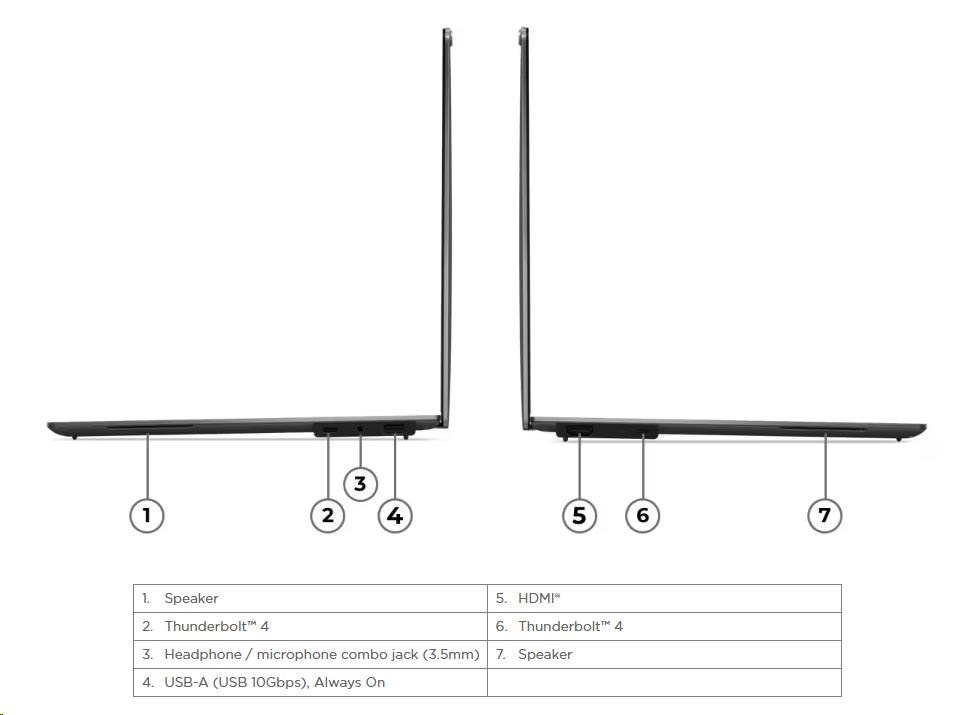 | Standartné porty | 1x USB-A (USB 10Gbps / USB 3.2 Gen 2), Always On 2x USB-C® (Thunderbolt™ 4 / USB4® 40Gbps), with USB PD 3.0 and DisplayPort™ 2.1 1x HDMI® 2.1, up to 4K/60Hz 1x Headphone / microphone combo jack (3.5mm) |