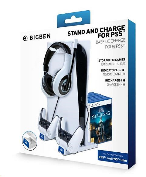 Umístěte svou herní konzoli PlayStation 5 nebo PlayStation 5 Slim do vertikální polohy s pomocí tohoto multifunkčního stojanu od společnosti Bigben Interactive. Součástí stojanu je dlouhý upevňovací šroub, který konzoli bezpečně zajistí ve vzpřímené poloze a zaručí, že se konzole nepřevrátí. Stojan dále nabízí dvě pozice pro nabíjení ovladačů DualSense a odkládací prostor až pro deset krabiček s vašimi oblíbenými hrami. Součástí balení je pak také držák na sluchátka, který můžete zavěsit přímo na konzoli.