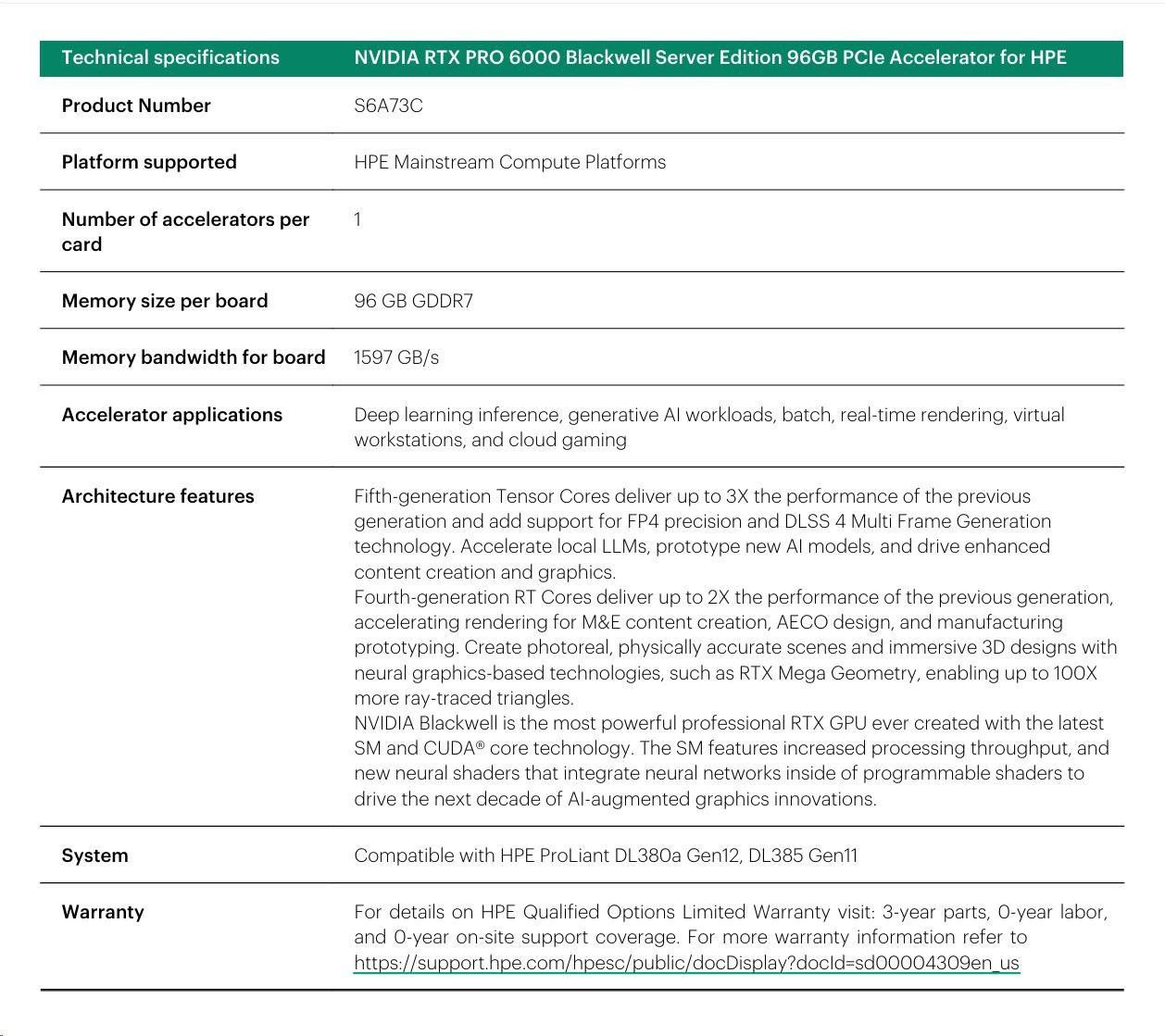 NVIDIA RTX PRO 6000 Blackwell Server Edition 96GB PCIe Accelerator for HPE