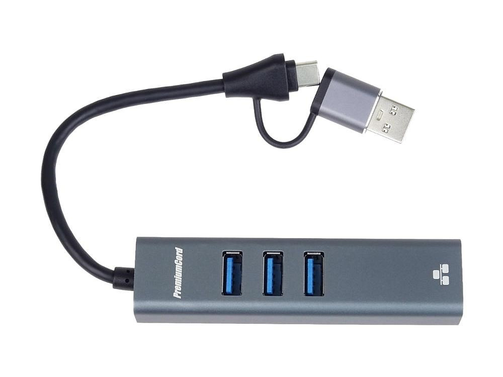 PremiumCord Adaptér USB-C a USB-A na Gigabit 10/100/1000Mbps + 3x USB 3.2 konektor