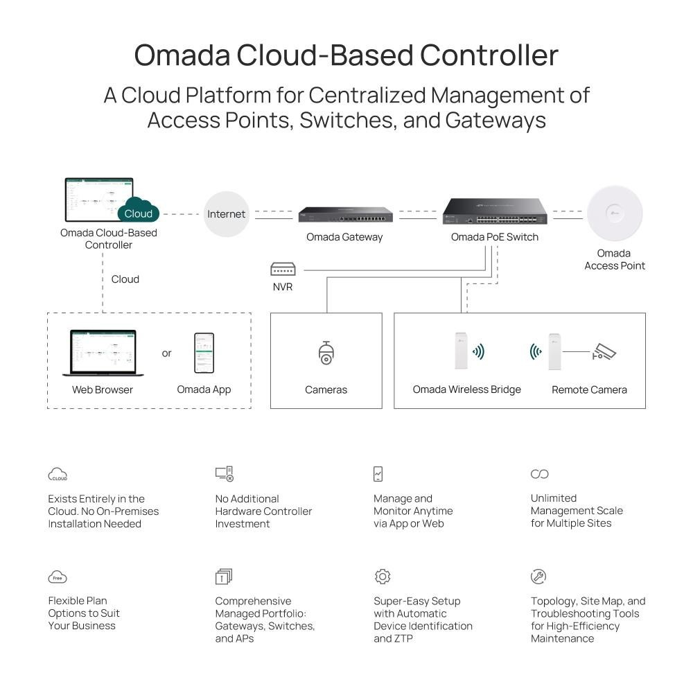 Cloudový kontroler Omada, existující kompletně v cloudu pro platformu softwarově definovaných sítí Omada (SDN), poskytuje 100% centralizovanou cloudovou správu přístupových bodů, switchů a bran – to vše z jednoho rozhraní. Není třeba investovat do dodatečného hardwaru nebo provádět instalaci na místě u zákazníka. Použití řešení Omada typu Zero-Touch umožňuje vzdálené nasazení a konfiguraci sítí ve více lokalitách, takže není nutné posílat technika, aby provedl konfiguraci na místě. Cloud Omada zajišťuje efektivní nasazení při nižších nákladech.