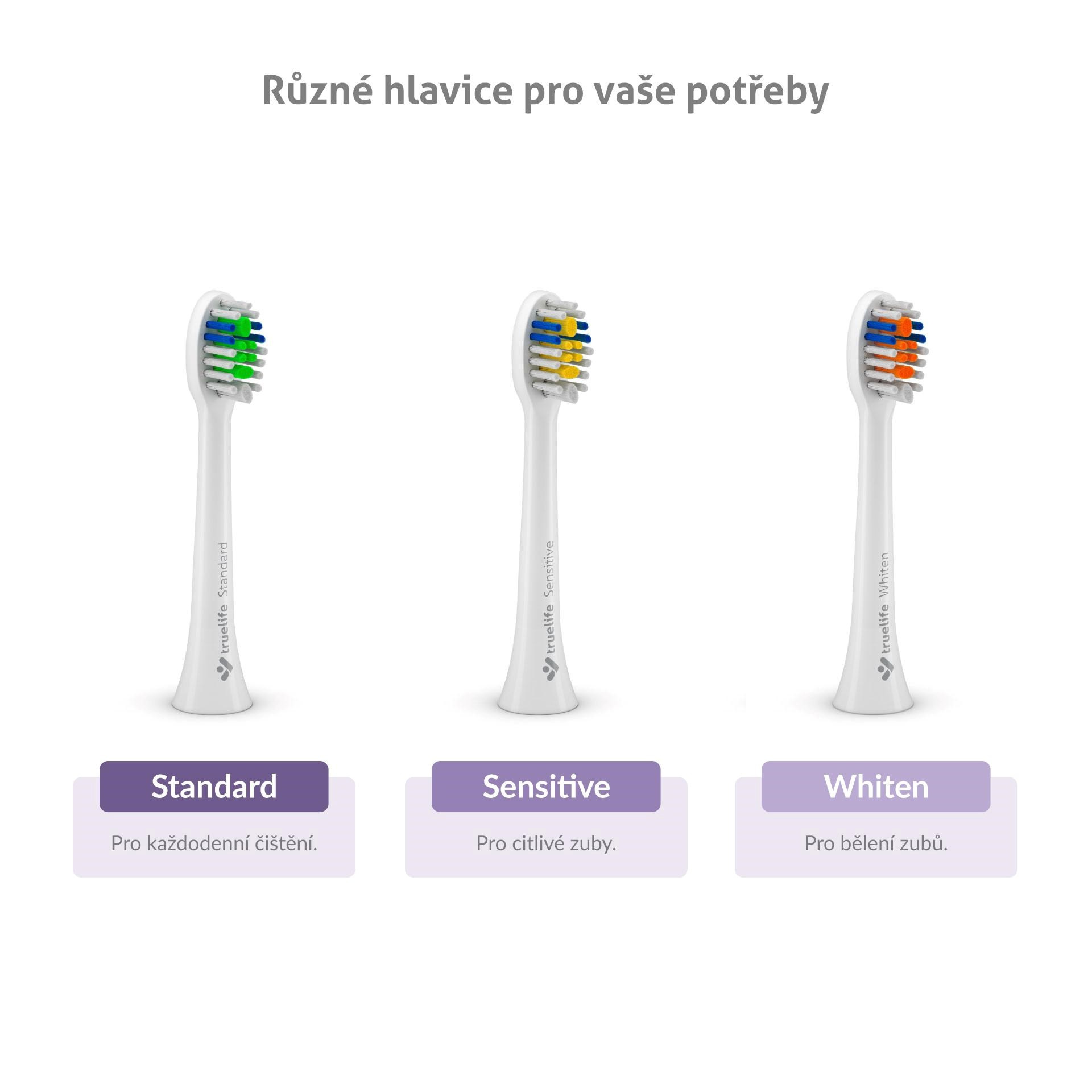 V každém balení SonicBrush Compact Duo naleznete celkem 6 náhradních hlavic různých typů – dvě hlavice Standard pro běžné čištění, dvě hlavice Sensitive pro citlivější zuby a dvě hlavice Whiten pro bělící efekt. Hlavice vydrží až 3 měsíce používání, poté se začnou třepit, ztrácí účinnost a navíc se na nich hromadí bakterie. Naštěstí jsou hlavice opatřeny modrými štětinami, které po 3 měsících vyblednou a vy tak víte, že je načase hlavice vyměnit.